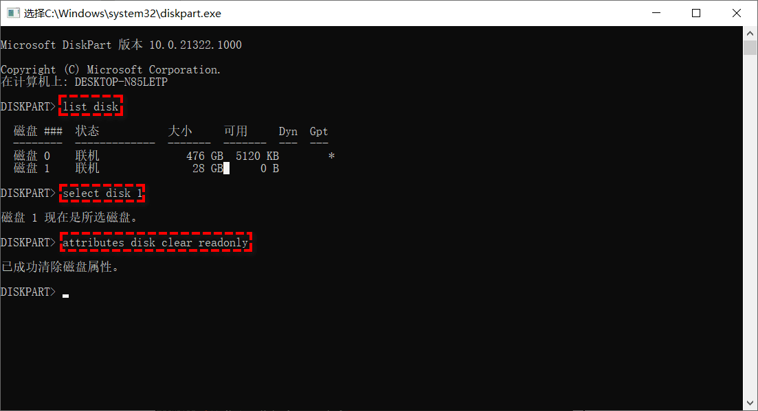 – attributes disk clear readonly:清除所选U盘的只读属性,解除写保护。